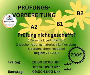 NACH einem Kurs! Intensive Auseinandersetzung mit Prüfungsbeispielen. Wöchentlicher 2h Präsenzunterricht + 2 Wochen Übungsmaterial inkl. Korrektur und Feedback